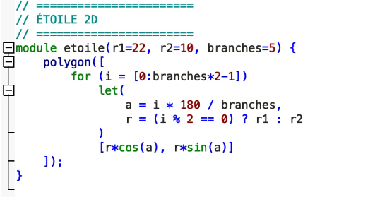 OpenSCAD ne propose pas directement une “étoile”, donc j’ai dû comprendre comment en dessiner une moi‑même.