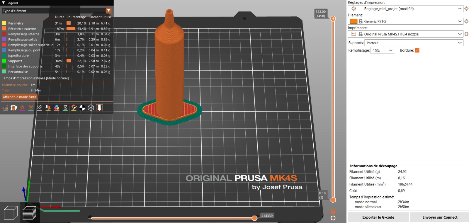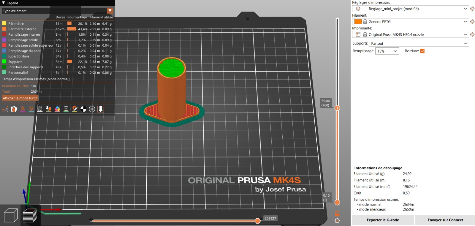 - Filament : PETG (pièce principale), Generic TLU (joint du piston)