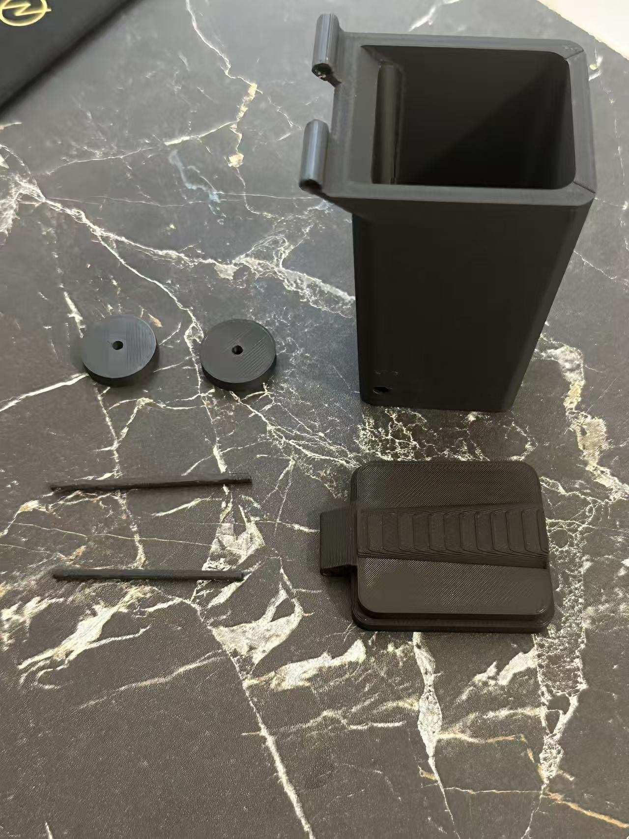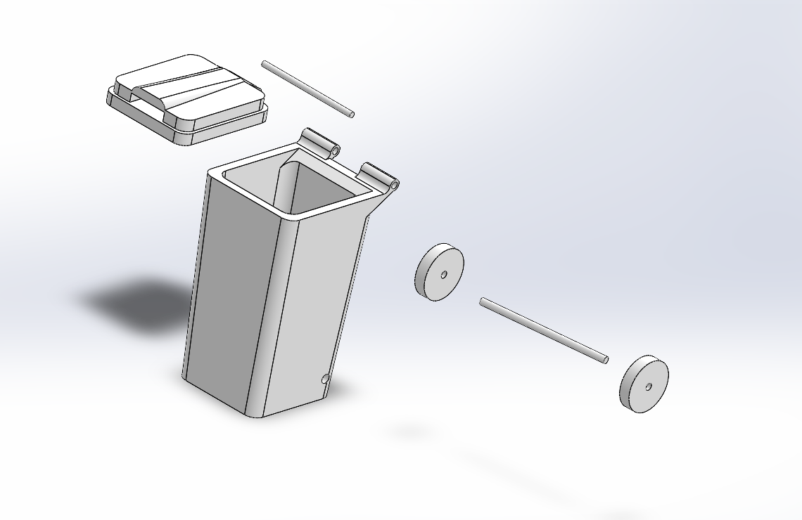 - Le couvercle, de dimensions 44 mm × 45,5 mm × 10 mm, relié au corps de la poubelle par une tige de 48 mm de longueur et de 2,5 mm de diamètre, fixée dans un trou de 3 mm de diamètre prolongé de 10 mm vers l’extérieur, permettant ainsi la rotation du couvercle.