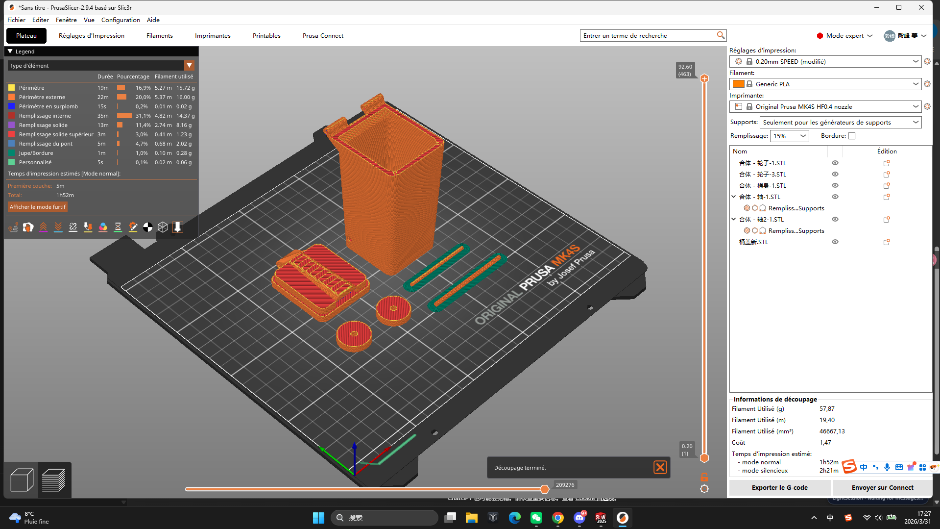 Nous avons choisi d’utiliser l’imprimante MK4S et d’imprimer en matériau PLA. La densité de remplissage globale de la poubelle est de 15 %, mais nous avons augmenté celle des deux axes à 70 % afin d’améliorer leur rigidité et de réduire le risque de rupture. Par ailleurs, pour ces deux axes, nous avons ajouté un bordure de 5 mm lors de l’impression afin de garantir leur bonne adhérence au plateau d’impression.