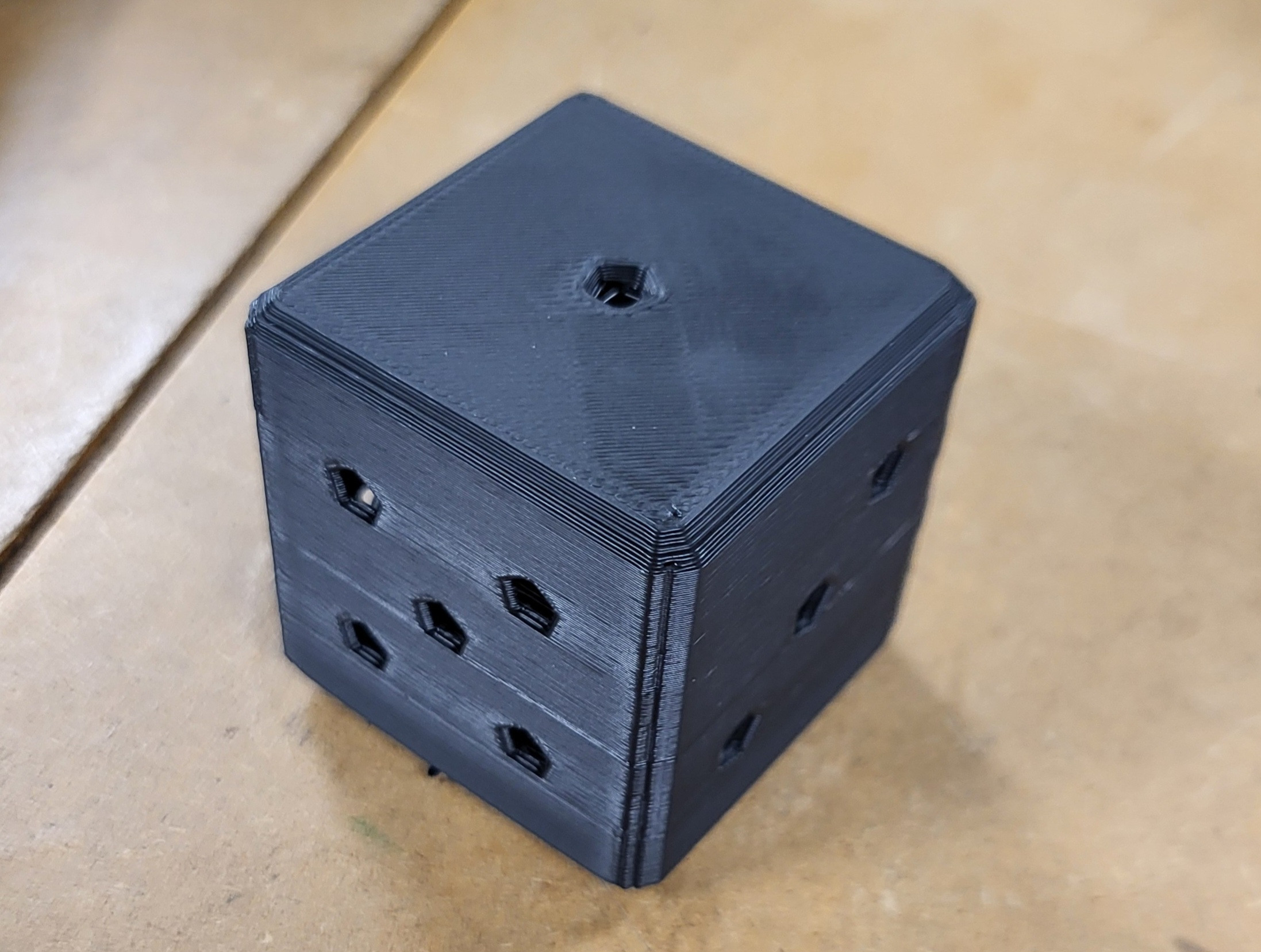 Conclusion : le poids est collé à l'intérieur de façon à faire ressortir la face 1 plus souvent. Cependant le poids étant de petite taille et imprimé en PLA, il est un peu trop léger pour que l'effet soit significatif. Pour faire un dé avec un truquage vraiment efficace il faudrait réaliser un poids de plus grande taille ou prendre une masse faite dans un matériau plus lourd.