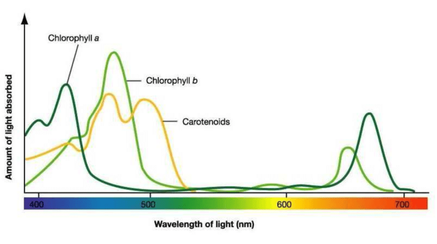 Ci dessous le spectre d'absorption des chlorophylles et des bêta-carotènes.