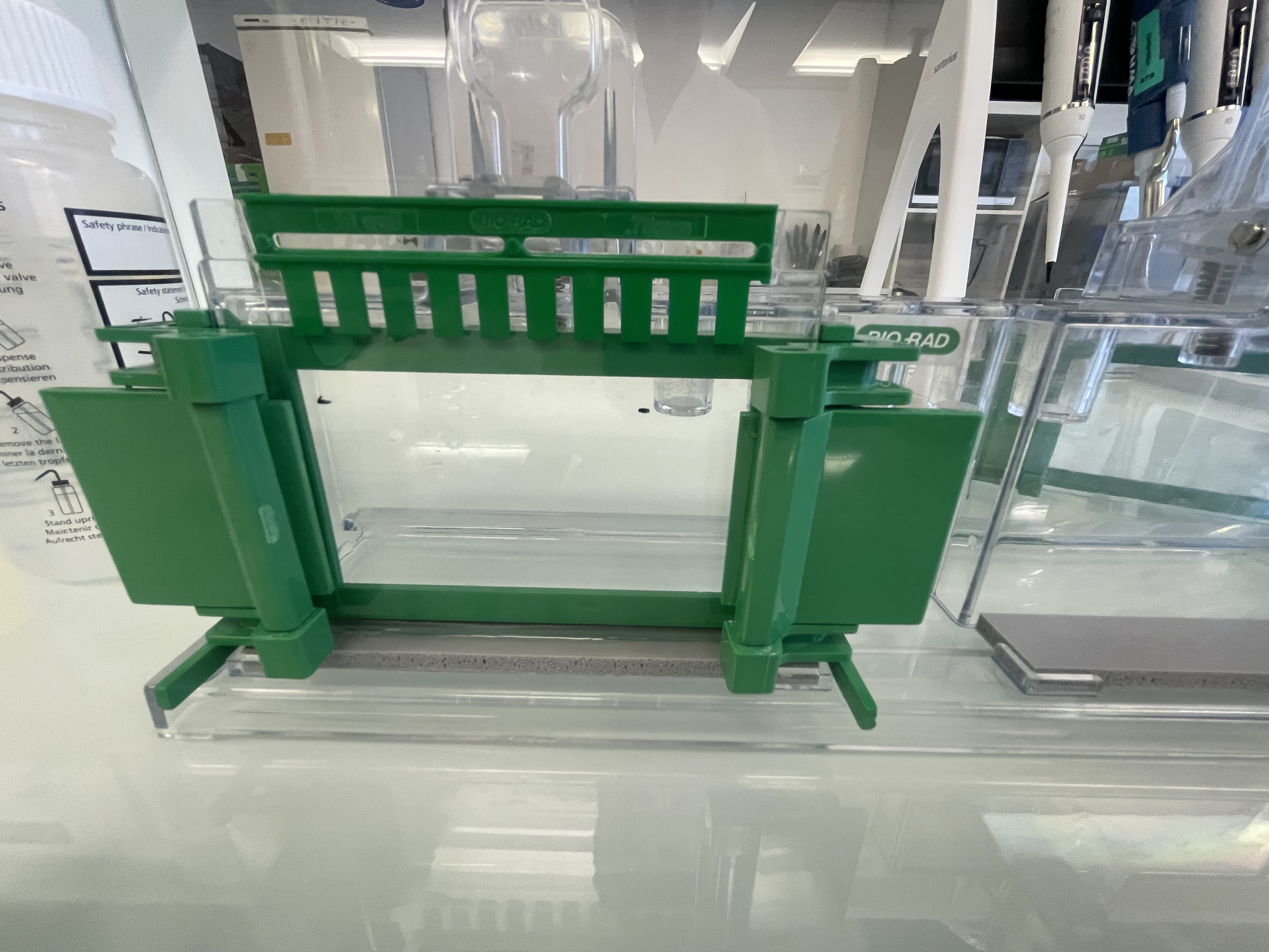 - Placer le gel sur un support. Si il y a plus d'emplacement que de gel par support, bien prévoir d'utiliser un "fantôme" pour assurer la conduction du courant.