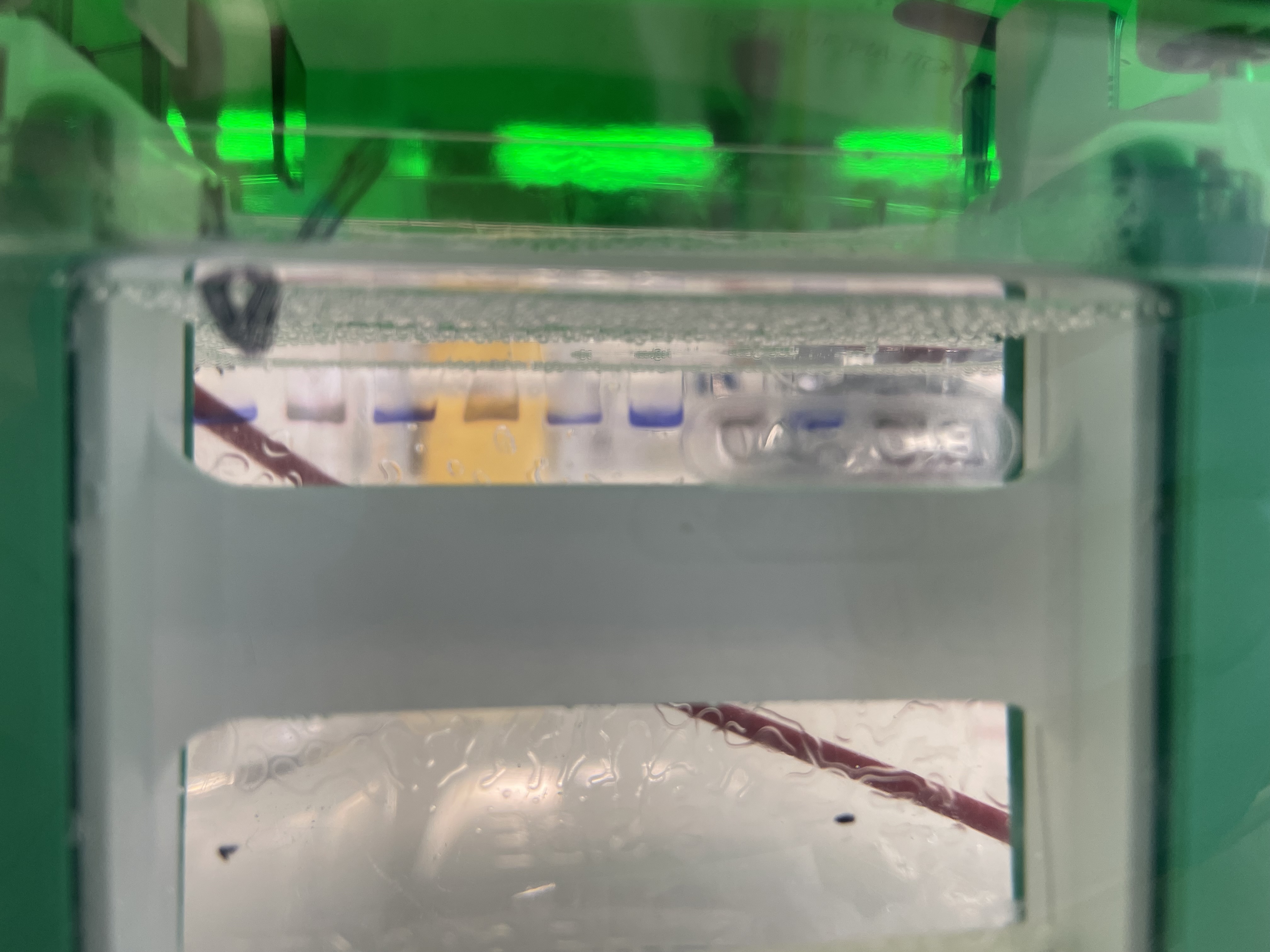 8. Retirez le peigne du gel, placez le plateau avec le gel dans la cuve de migration. Mettez le tampon de migration (par exemple TBE-0.5x) dans la cuve pour couvrir le gel.