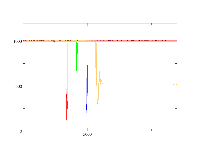 Le code est modifié pour lire les signaux provenant de 5 phototransistors. Compte tenu des résistances disponibles, on passe à R=130 kΩ. Le code est ici. La breadboard est réarrangée pour permettre de circuler facilement autour des 5 phototransistors. Lors d'un passage de la main au-dessus des phototransistors on obtient :