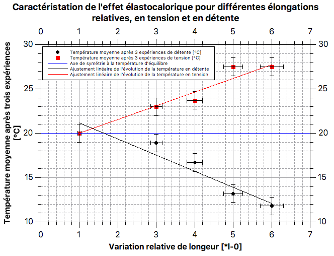 • La variation de température est symétrique lors d'un cycle avec temps d'homogénisation. Si l'élastique est initialement à 20°C, qu'il atteint 30°C une fois tendu (+10°C), que l'on attend que sa température revienne à 20°C alors qu'il est maintenu en tension, lorsqu'on le relâchera sa température avant équilibre sera de 10°C (-10°C). C'est aussi ce que montre le modèle théorique pour des ordres de grandeurs cohérents de température et de variation de longueur.