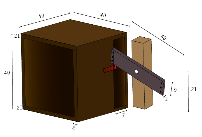 L'enceinte sera finalement fabriquée à partir de matériel de récupération. De longues planches de bois relativement identiques sont découpées à la scie circulaire en 24 blocs de 40 x 9 x 2 cm. Pour former les murs de la machine, ces blocs sont assemblés par 4 à l'aide de colle à bois : les surfaces à coller sont d'abord poncées afin d'optimiser l'adhérence de la colle. Nous attendons que la roue soit fabriquée avant de calculer la taille de la fente nécessaire à son passage. Ainsi, l'enceinte du réfrigérateur aura sera un cube de 40 x 40 x 40 cm, avec un volume interne de 36 x 36 x 36 cm (les parois ayant une épaisseur de 2 cm), que l'on peut voir ci-dessous. Les trous dus aux irrégularités des planches seront comblés au mieux. Il est prévu d'ajouter 2 cm d'épaisseur de laine de verre, pour un volume interne final de 34 x 34 x 34 cm (N.B. : nous ne le ferons pas en pratique, n'ayant pas d'outils pour faire de mesures, la construction du prototype est purement démonstrative, il n'est pas utile d'utiliser un matériau facultatif et “précieux”).