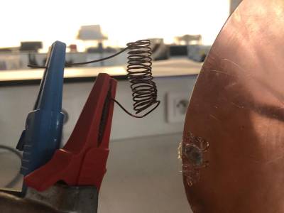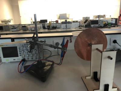 -Tester si on observe un courant: Une fois notre disque de faraday mis en place, nous voulions vérifier si nous avions bien un courant. Nous avons donc commencé avec le disque de 10 cm de diamètre, nous avons tout mis en place (l'aimant etc). Puis nous avons utilisé un voltmètre de contact, une des extrémités en contact avec le centre du disque et l'autre avec l'extérieur du disque. On a ensuite fait tourner le disque et nous avons observé un courant d'environ 10 micro-ampères. C'est un courant très faible, mais on s'y attendait, il s'agit du disque le plus fin et le plus petit que nous ayons.