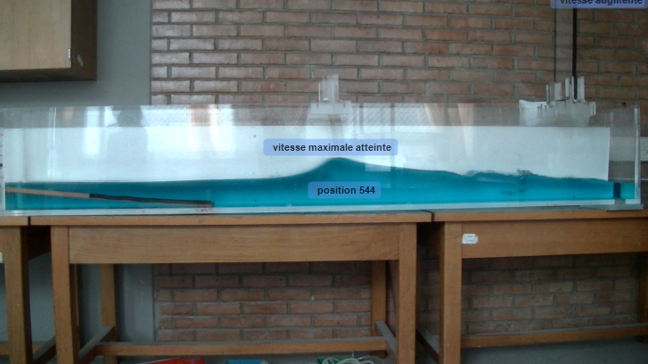 * l'accélération de la vague : contrairement à l'océan où la vague peut se propager dans plusieurs directions, dans notre modélisation, le sens de propagation est unidirectionnel (le volume d'eau à l'origine de la formation de la vague étant à l'extrémité de l'aquarium).Par conséquence, le volume qui était bloqué par la plaque s'ajoute au volume non bloqué, entrainent une seconde accélération
