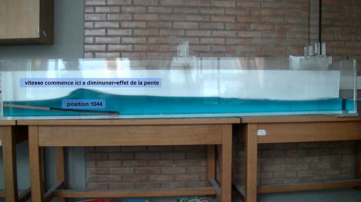 On constate bien que la hauteur de la vague augmente à l'approche de la plaque modélisant la côte, ce qui est en accord avec la théorie.
