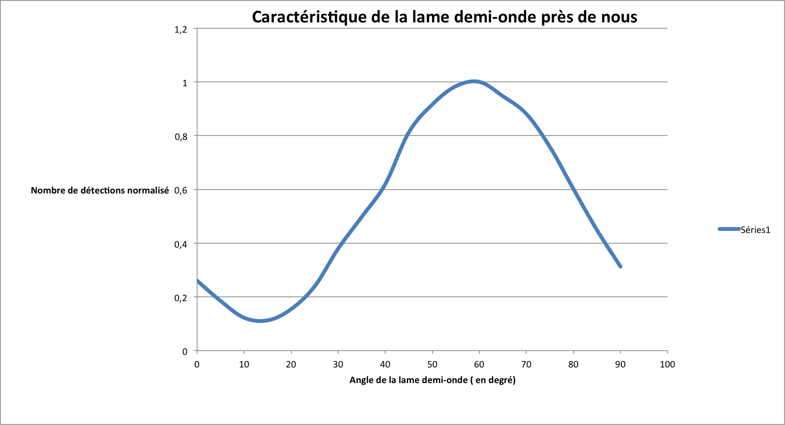 Interprétons ces résultats : pour la première lame, tout d'abord, on observe un maximum de détections autour de 60° ( en fait, 58° ). Sachant que les photons qui arrivent sur la lame sont verticaux, et que l'on a un cube PBS qui ne laisse passer dans la fibre qu'une polarisation horizontale, cela signifie que lorsque cette lame est orientée à 58°, elle transforme une polarisation verticale en polarisation horizontale. Elle laisse donc passer une polarisation verticale et on appellera donc cet axe l'axe vertical. A contrario, l'axe horizontal est tel qu'il laisse passer une polarisation horizontale, et donc tel qu'il ne laisse pas passer une polarisation verticale. C'est donc l'angle tel qu'on ait un minimum ( ici, 12° ). De même pour la seconde lame, l'axe vertical est à 81° et l'axe horizontal à 36°. On remarque tout d'abord qu'entre les deux axes d'une lame, on a bien un angle de 45°. Cela est cohérent car on sait qu'une lame demi-onde modifie la polarisation d'un angle égal au double de son angle par rapport à son axe. Entre une polarisation verticale et horizontale, on a 90°, il est donc logique d'avoir 45° entre les deux axes. Plus globalement, on observe bien des courbes en cos^2, caractéristiques de la loi de Malus. Celle-ci est donc vérifiée lorsqu'on compte les photons de manière individuelle.