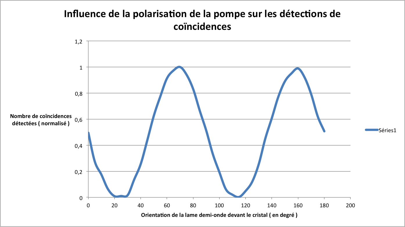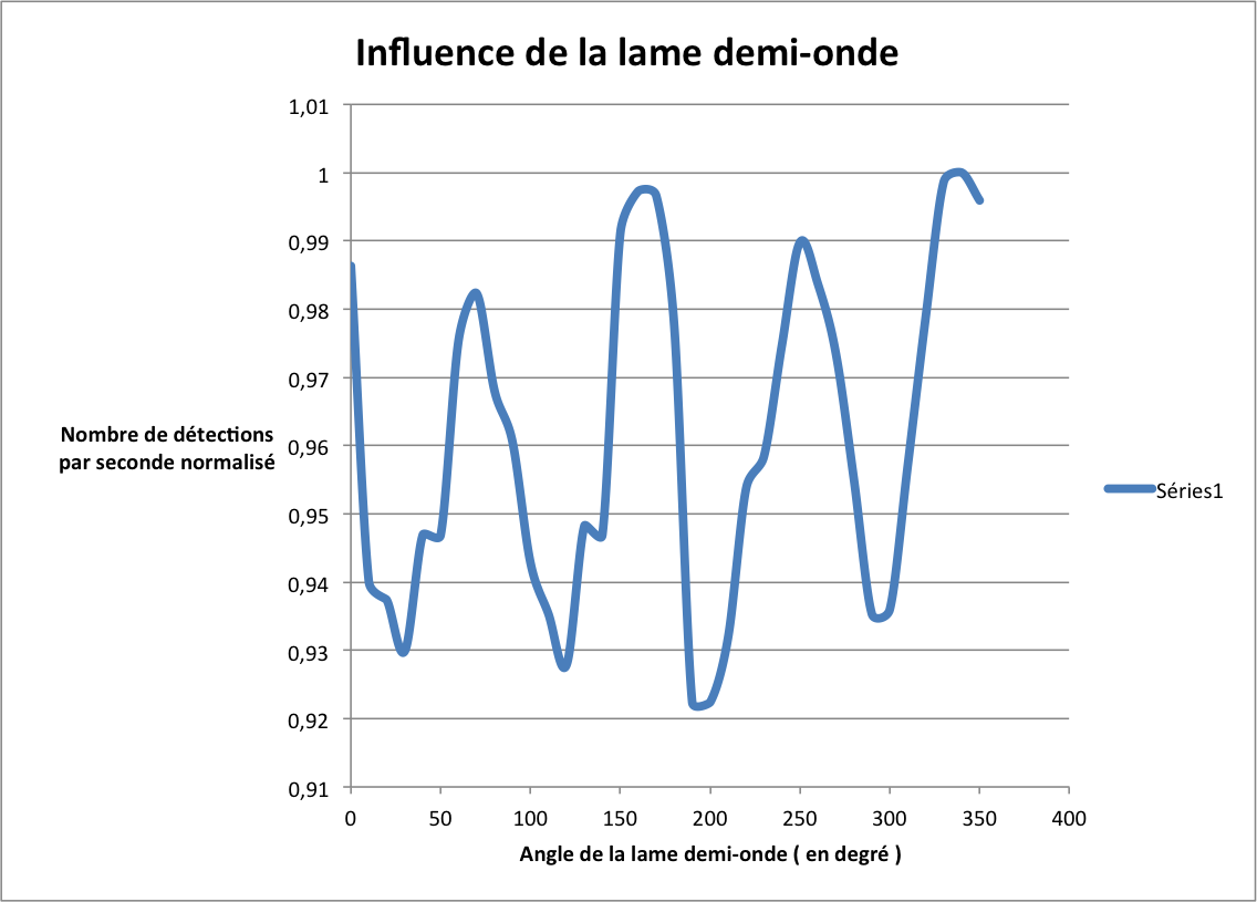 On voit que le nombre de détections ( en ayant enlevé les cubes PBS ) ne varie presque pas ( 7% d'écart au maximum ). Cela pourrait s'interpréter comme le fait que la source émet bien un mélange de paires de photons de polarisation verticale et de paires de photons de polarisation horizontale.