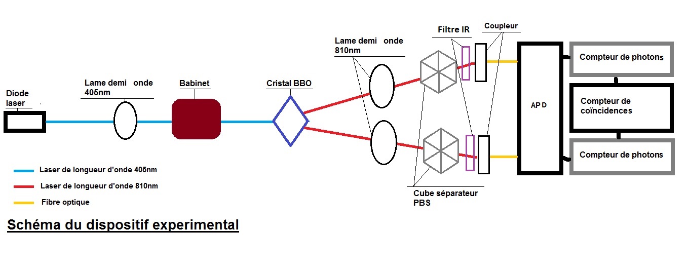L’idée principale du montage expérimental est d’envoyer un faisceau laser à 405nm sur un cristal de type BBO qui va produire, par des processus non linéaires des paires de photons intriqués à 810nm. Les photons sont produits de part et d’autre de l’axe du laser incident avec un angle de 3° (théoriquement). Il s’agira ensuite de détecter les photons intriqués en utilisant différentes configurations de lames demi-onde afin de modifier la polarisation des photons intriqués. La théorie prévoit un critère numérique du taux de corrélation entre les photons intriqués. Les différentes mesures devraient permettre de calculer ce taux de corrélation et de valider, ou d’invalider, les inégalités de Bell.