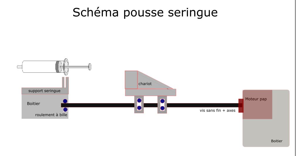 Pour le système de pousse seringue nous avons choisi de nous inspirer du système disponible sur ce site. Voici des schémas 2D et 3D de notre système (vue de côté) :