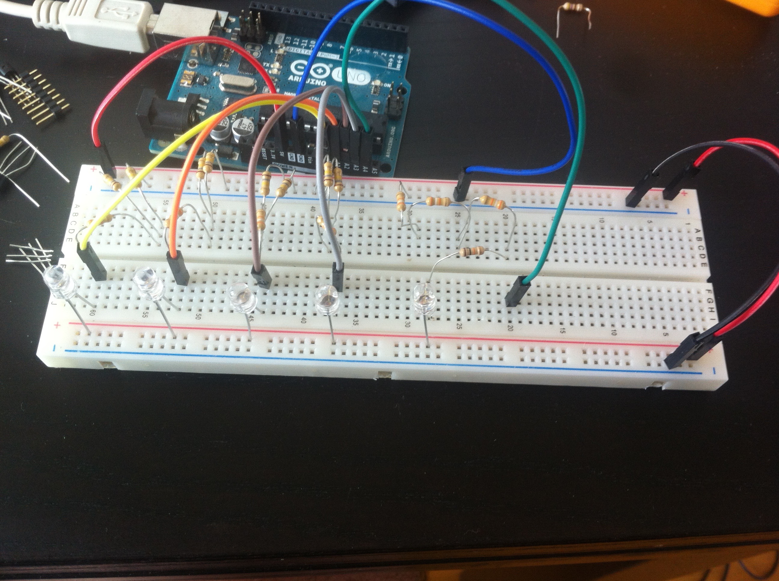 • faire des câbles longs d'environ de longueur comprises entre 50 cm et 1m50, pour relier breadboard/Arduino aux paires LED/phototransistor. On a 5 phototransistors, donc 4 intervalles. Si on prend un retrait de 2cm à chaque extrémité, la longueur du tube est de 96 cm, soit des intervalles de 96/4 = 24 cm. Pour chaque longueur, on a 4 fils à préparer et sertir. Longueurs : 50cm, 75cm, 100cm, 125cm, 150 cm. Ou alors on prépare un seul fil de chaque longueur pour les émetteurs des phototransistors, et tout le reste c'est un Vcc commun, et une masse.
