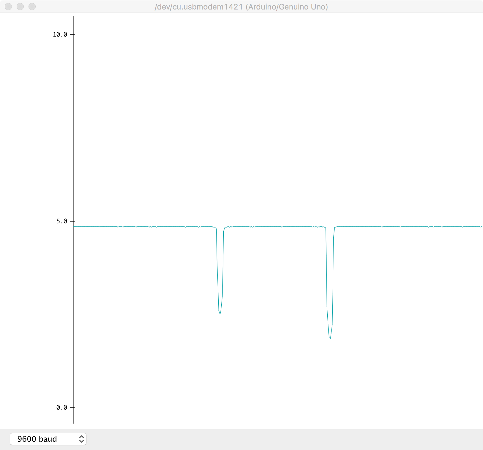 à gauche, lumière ambiante du jour→obscurité totale (on capuchonne la LED avec un corps de stylo). La forme de la réponse est due à la difficulté à positionner le capuchon vite ; à droite, passage rapide d'une main à plat au dessus de la LED. Durée des captures : moins de 2s (9600 bauds, pas de délai dans la boucle). Dans ces conditions d'éclairement, la variation de tension est pratiquement pleine échelle 0-5V, rapide. Programme utilisé : ReadAnalogVoltage (dans les exemples de l'IDE).
