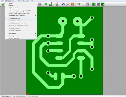 Maintenant qu'on a importé correctement le schéma dans Percival, la fraiseuse doit être informée formellement des endroits où il va garder le cuivre pour créer les pistes. Pour cela, si vous êtes sûr que votre schéma est bon, cliquez “Calculer les Contours” et puis cliquez sur OK. Si certains contours sont absents, ce qui peut arriver, vous allez devoir les tracer manuellement. Cela se fera en sélectionnant l'option Ajouter des segments de contours, qui vous sera accessible après avoir fait faire les contours du circuit au programme. L'option Rendu final facilitera la visualisation des segments absents sur le circuit.