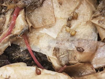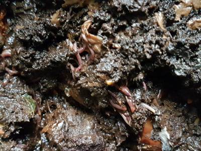 Importance colonisation micro organismes, rôle important favorisant la décomposition de la matière, les vers ne décomposant que la matière grossière, si ils ont a disposition un apport régulier en matière fraîchement décomposés. L'apport d'un matière régulière et diversifiées comme les déchets ménagers compostables sembles favoriser la reproduction même si les vers ici sont en forte densité dans le bac . On observe de nombreux juvéniles et cocons dans les déchets ménagés compostables et de plus grand organismes en niveau du fumier . Odeur humus Allure compost non mature
