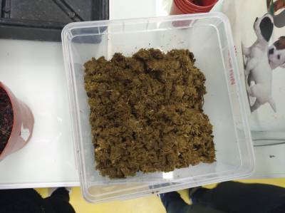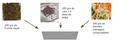A chaque extrémité est placé du crottin vieilli et des déchets organiques (400 grs au total). Les vers sont alors placés au centre du bac.