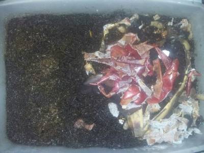 Dès que les épluchures de pommes de terre et champignon se sont liquéfiées (premiers à se décomposer) les vers changent de coté et se retrouvent dans les déchets ménagés, ils délaissent le fumier.