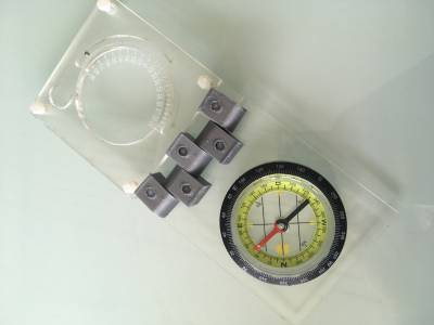 La boussole est l’accessoire indispensable pour les géologues. Il s’agit d’un instrument de navigation permettant de s’orienter dans le plan. La boussole est constituée d’une aiguille magnétique sensible au champ magnétique de la Terre et une rose des vents indiquant les directions cardinales : Nord, Sud, Est, Ouest. L’aiguille peut tourner librement et mesure l’angle entre le Nord magnétique (qui est différent du Nord géographique) et un point donné. Pour compléter les données de la boussole, un clinomètre peut être ajouté. Le clinomètre permet de mesurer l'inclinaison d'un plan par rapport à l'horizontale (pente d'un terrain, pendage d'une couche géologique,…).