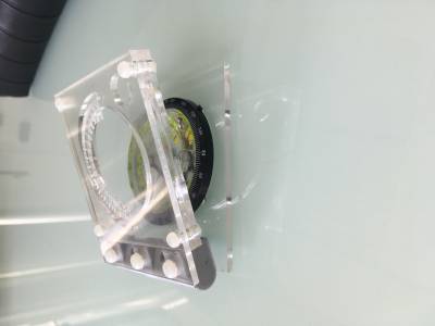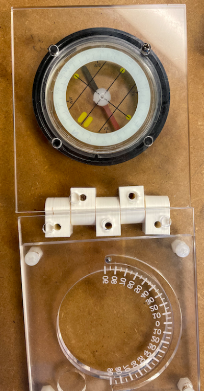 Afin de créer un nouveau modèle de boussole plus précis et fonctionnel, nous avons réutilisé une boussole à liquide présente sur un modèle de boussole premier prix. C’est un type de boussole de navigation dans lequel l’aiguille magnétique est immergée dans le liquide et permet de donner une lecture plus stable (photo en figure 1). Nous avons réfléchi à un modèle de support pour y fixer la boussole et y intégrer un clinomètre ainsi qu’un niveau à bulle. Nous avons pensé à un modèle de support en Plexiglas avec un couvercle afin de protéger la boussole.