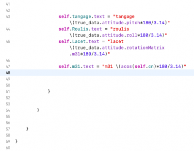 - Codage d'un début d'application (cf codage) avec les valeurs de tangage, roulis et lacet et test avec la fonction rotation sur le lacet pour avoir les bonnes variables.