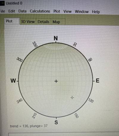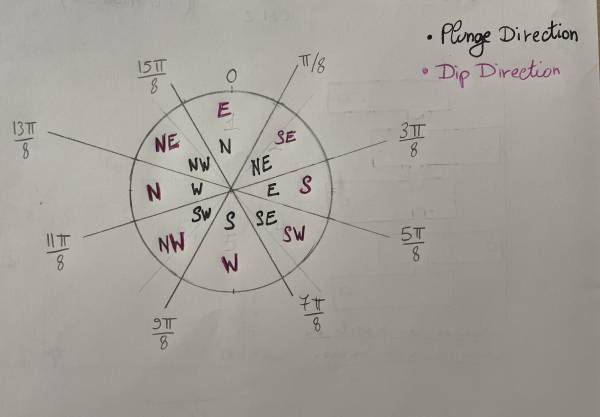 On peut donc utiliser les coordonnées pour l'application. Il est à noter que ce qui nous intéresse, autre que le plunge, trend, strike et dip, sont le PlungeDirection et DipDirection. Ces dernières vont être noté en terme de direction Nord-Est-Sud-West. On peut les trouver à partir des premières. Pour cela on peut faire un cercle où l'on place le 0 à la vertical et l'on peut ensuite regarder les angles du trend pour les lignes et du strike pour les plans, formés avec cet axe 0, dans le sens des aiguilles d'une montre. Il est à noté que quand le trend tend vers le Nord (donc à l'axe au 0), le strike tend vers l'Est.