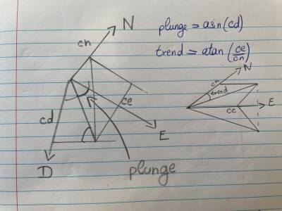 En effet, plunge = pi/2 - acos(cd) = asin(cd) et trend = atan(ce/cn) d'après le schéma ci-dessous.