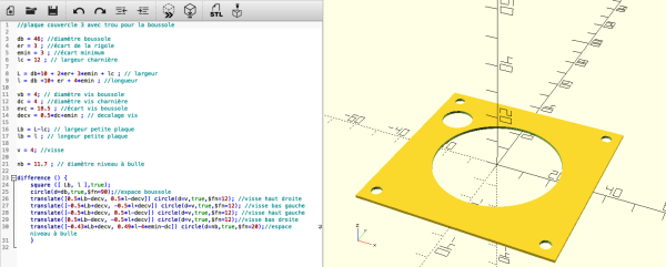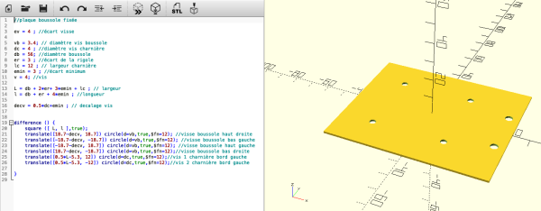 Voici les modélisations des plaques sur Open Scad avec le code correspondant :
