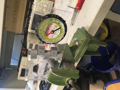 Nous avons confié la boussole à nos camarades partis en stage de terrain afin qu'ils la testent. Ils ont comparé notre boussole avec d'autres boussoles professionnelles. Ils ont obtenus les mêmes résultats avec leurs boussoles et la nôtre. D'après leur retour, la boussole semble donc bien fonctionner et le clinomètre est suffisamment précis. Cependant la charnière doit être améliorée afin d'apporter plus de solidité. Nous avons pensé à améliorer le modèle des pièces de la charnières avec des cotés arrondis et des pas de vis plus petit. Elle sera ainsi mieux fixée aux plaques et le couvercle se fermera facilement.