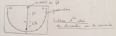- réflexion sur la création du clinomètre : idées : modèle de pendule attaché sur un plexiglas ? rigole creusée dans le plexiglas avec une bille ? tube creux en plastique collé au plexiglas avec une bille à l'intérieur ?