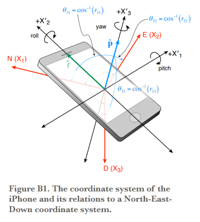 La figure ci-dessus montre parfaitement qu'il existe une relation entre les coordonnées de l'iPhone et celles du système de coordonnées North-East-Down. En effet, les coordonées du téléphone sont le tangage, le roulis et le lacet (nommées respectivement sur la figure yaw, roll et pitch). Pour obtenir les données voulues pour l'application à partir de celles-ci, on peut utiliser une matrice de rotation utilisant le système de coordonnées North-East-Down. Ainsi, on va prendre les cosinus et sinus des tangage, roulis et lacet et en déduire les pôles North, East et Down. Pour les cosinus directeurs de la ligne on utilise : pour la ligne suivant North, la matrice m21 ; pour la ligne suivant East, la matrice m22 ; pour la ligne suivant Down, la matrice m23. Pour le plan on utilise : pour le pôle North, la matrice m31 ; pour le pôle East, la matrice m32 ; pour le pôle Down, la matrice m33.