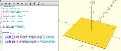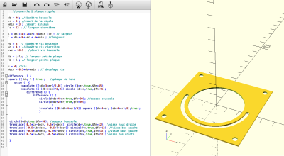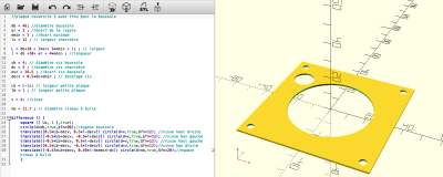 Voici les modélisations des plaques sur Open Scad avec le code correspondant :