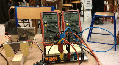 Dans ce circuit, le courant inverse $i$ produit par la photodiode passe par une résistance $R$ et induit une tension $U$ à ses bornes. Cette tension peut-être mesurée par un oscilloscope, un voltmètre ou même une carte Arduino.