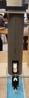 Le tuyau est en plastique est fait 10 cm de diamètre et 40 cm de hauteur. Il est découpé en bas sur 16 cm de hauteur et 4,5 cm de largeur afin de pouvoir laisser passer la turbine. Le tuyau permet de faire rentrer l'eau venant de la cuve, de la faire se diriger sur la turbine, et de la faire tomber dans la rigole finalement.