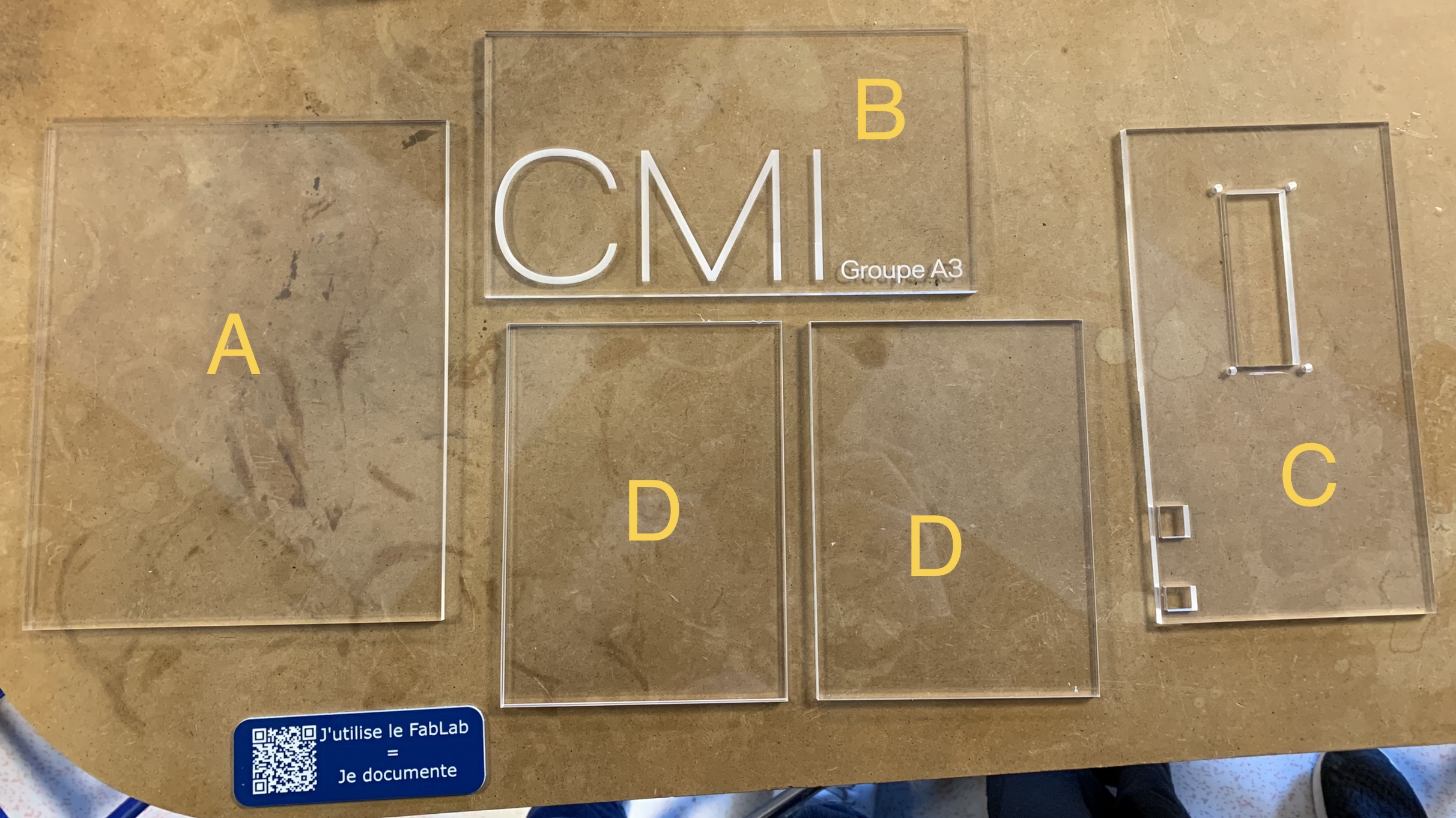 Durant cette avant-dernière séance, nous nous sommes uniquement occupés de la réalisation de la boîte. Après avoir fignolé nos visuels pour la découpeuse laser, nous avons débuté la découpe. Nous avons au début rencontré un problème : la découpeuse laser ne reconnaissait pas le rouge de la découpe, ce qui avait pour conséquence de ne rien faire du tout sur la plaque. Après avoir épaissi davantage les contours, nous sommes enfin passés à la vraie impression. Nous avons jusqu’ici conçu la base (A) qui correspond à la face inférieure de la boîte, la face avant (C), la face arrière (B) et les faces latérales (D). Nous nous occuperons la prochaine fois de concevoir la face supérieure de la boîte et nous imprimerons la face avant (C) car nous avons mal placé les deux embouts de l’Arduino, conformément à la paroi de droite.