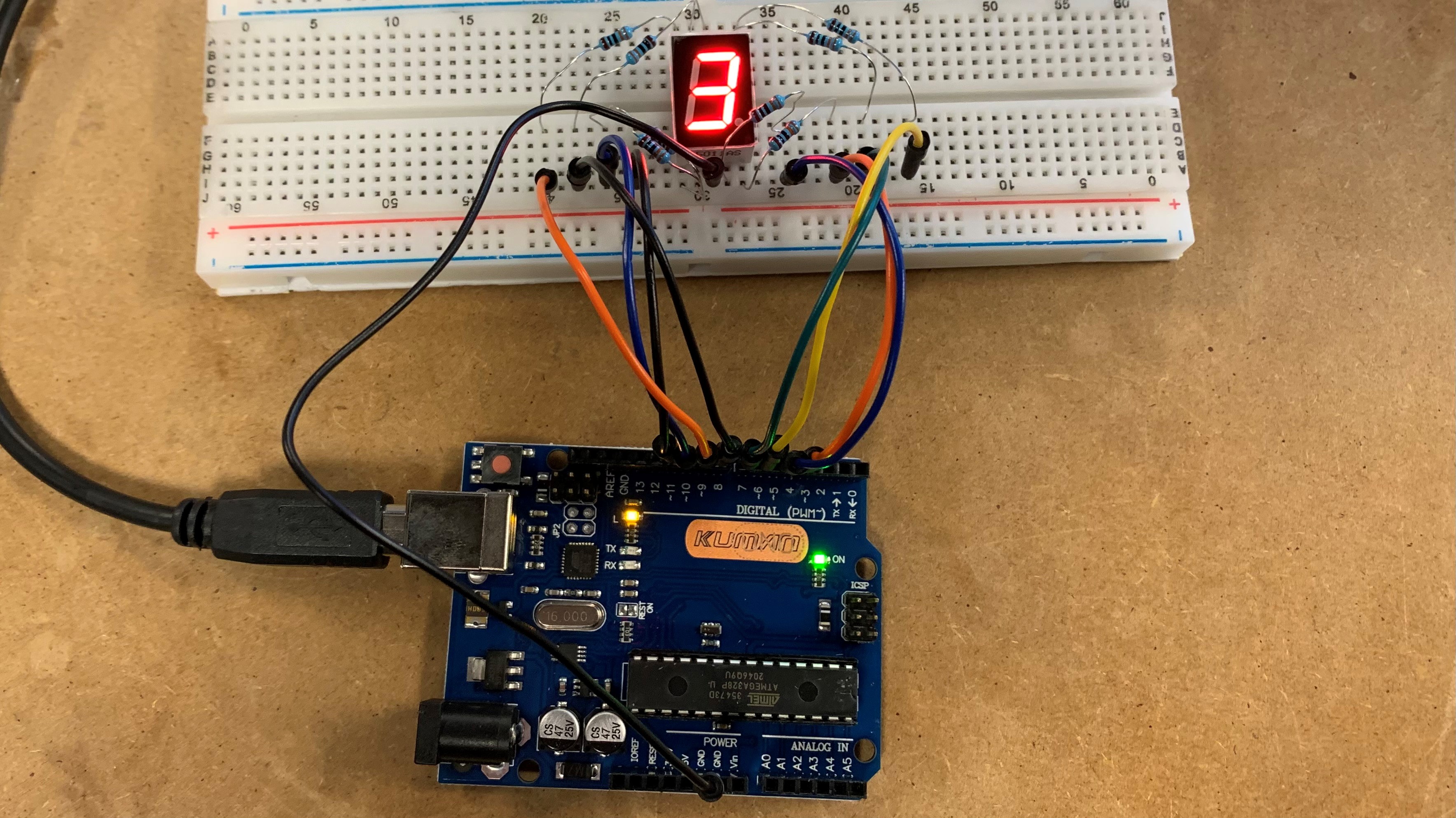 Ensuite, nous voulions tester un autre système. Nous voulions essayer l'afficheur de chiffre, à 1 caractère. Nous avons de nouveau procédé à quelques recherches sur internet jusqu'à trouver une page expliquant comment l'utiliser (voir la source). Néanmoins, après de nombreuses tentatives, cela n'a pas fonctionné. Nous avons donc poursuivi nos recherches jusqu'à tomber sur une page du site officiel d'Arduino qui présentait un code et son montage électrique (voir la source). Nous avons donc utilisé le code fourni et branché tous les câbles. L'une des terminaisons de l'afficheur est branchée à la terre, tandis que presque toutes les autres terminaisons sont reliées à l'Arduino (voir la photo ci-contre). Cette fois-ci, après plusieurs essais en raison d'un problème dans le code d'abord, et de branchement ensuite, tout a bien fonctionné et nous avons pu voir sur l'afficheur une suite de chiffres défiler (de 0 à 9).