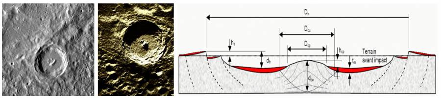 • Cratère complexe : plus large avec un pic central (créé par le soulèvement du fond du cratère lors du rebond) et des parois en terrasses.