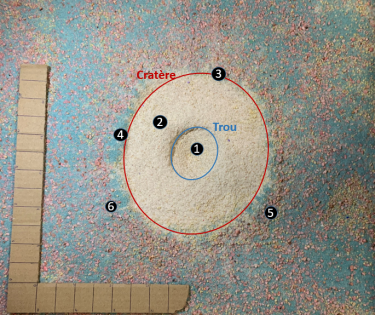 5: Ejecta: il s'agit de fragments du substrat (ici essentiellement les grains de semoule) éjectés du cratère par le rebond. On remarque que cette couche d'éjectas est plus épaisse à proximité du cratère et plus mince, jusqu'à inexistante en s'éloignant. Cette observation est également faite sur des cratères réels.