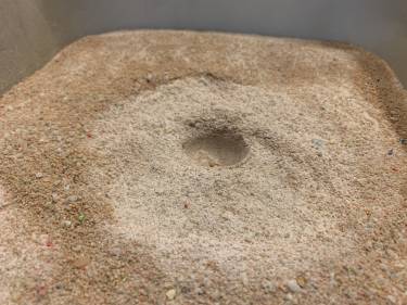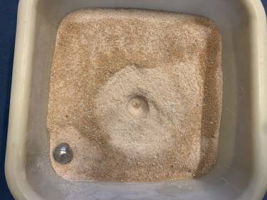 - Sable de quartz (grains de 0,1 à 0,5mm) seul. Le cratère s'affaisse directement et la bille s'enfonce trop. Le rendu n'est pas concluant