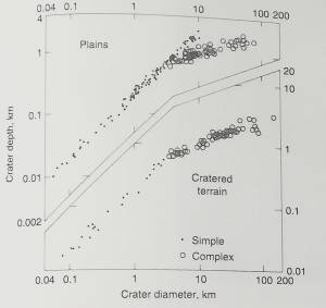 Il faut néanmoins savoir qu'en théorie, la profondeur du cratère en fonction du diamètre forme une fonction logarithmique en base 10 (comme visible ci-après pour les cratères martiens dans “The surface of Mars” de Michael H. Carr). En ce qui nous concerne, cette répartition pourrait être devinable mais rien ne nous permet d'être catégoriques.