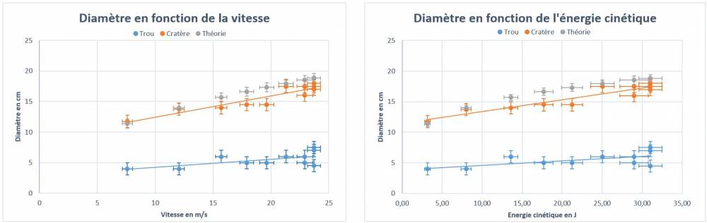 Nous allons maintenant essayer de trouver une loi simple entre la vitesse de l'impacteur (ou son énergie cinétique) et le diamètre du cratère. On obtient alors les graphiques suivants :