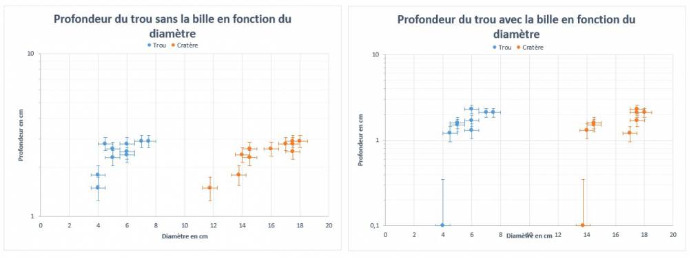 Enfin, nous avons décidé de nous intéresser au rapport entre la profondeur et le diamètre du cratère. Nous avons donc tracé deux graphiques de la profondeur (l'une avec la bille et l'autre sans) en fonction du diamètre du cratère (en orange) et du trou (en bleu).