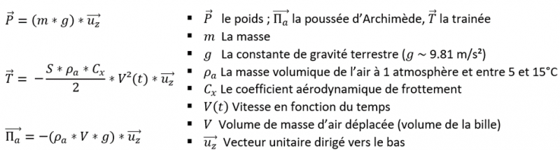 Nous allons ici prendre le cas classique d'une chute libre sans vitesse initiale (nous avons fait de notre mieux pour “lâcher” les billes et ne pas les jeter). Nous pouvons donc prendre en compte l'action de trois forces sur notre bille: le poids, une force de frottement (que l'on appelle la “trainée” de l'air) et la poussée d'Archimède. Ces forces sont donc définies comme suivant: