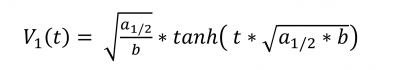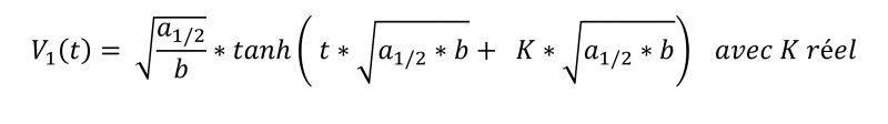 Il nous faut maintenant déterminer la constante d'intégration. On utilise donc les conditions initiales: comme expliqué précédemment nous avons fait de notre mieux pour lâcher la bille et ne lui conférer aucune vitesse initiale. On prend donc la condition telle qu'au temps 0, la vitesse est nulle. On trouve ainsi que la constante K est nulle. Cela nous donne donc la formule de la vitesse suivante: