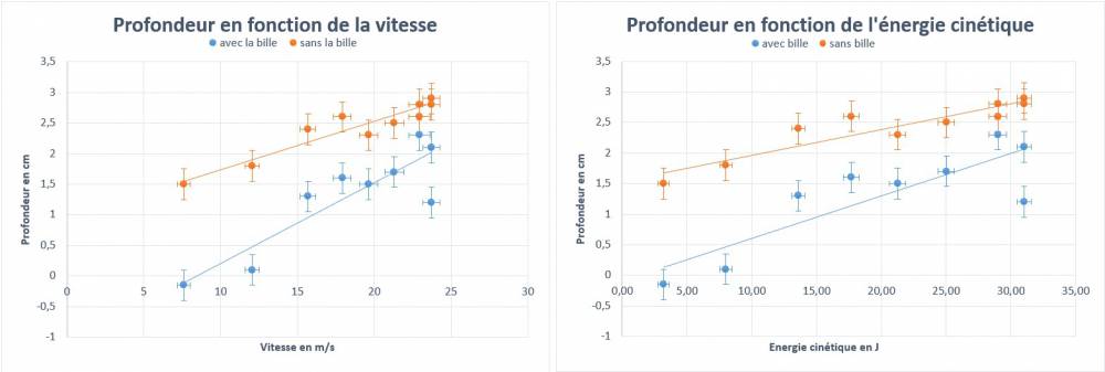 On peut ensuite tracer ces mêmes graphiques pour voir si les mêmes relations existent entre la profondeur du cratère et la quantité de mouvement ou l'énergie cinétique. On obtient alors la figure suivante dans laquelle nous avons distingué la profondeur avec la bille (on mesure l'écart entre la surface et le haut de l'impacteur) et sans (on retire la bille avec un aimant et on mesure la profondeur du trou résultant) :