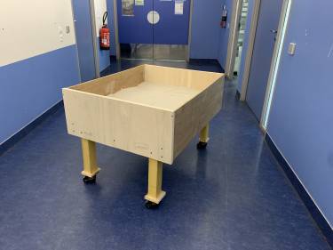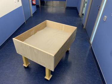 Nous avons donc opté pour un plus grand réceptacle, un bac sur pieds roulants d'un mètre de longueur, 80 cm de largeur et 21,5 cm de profondeur, construit par nos soins (avec une palette, des planches et des chevrons), afin de négliger l'effet des bords de la bassine sur la déformation et d'avoir des cratères d'impacts entiers. Néanmoins, le bac n'est pas encore assez grand pour contenir les éjectas les plus fins (négligeables) lorsque la bille est lâchée d'une hauteur importante.