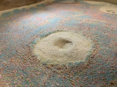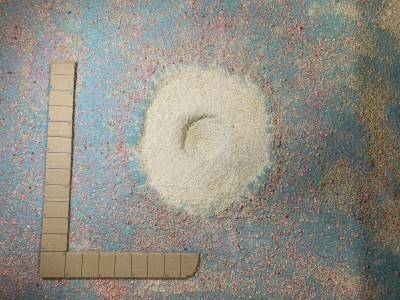 - Mélange 1/3 semoule, 1/3 farine, 1/3 sable (proportions en volume !), la forme du cratère obtenu est assez représentative avec ce mélange (voir photo ci-dessous), on opte donc pour ce mélange en guise de substrat de réception.
