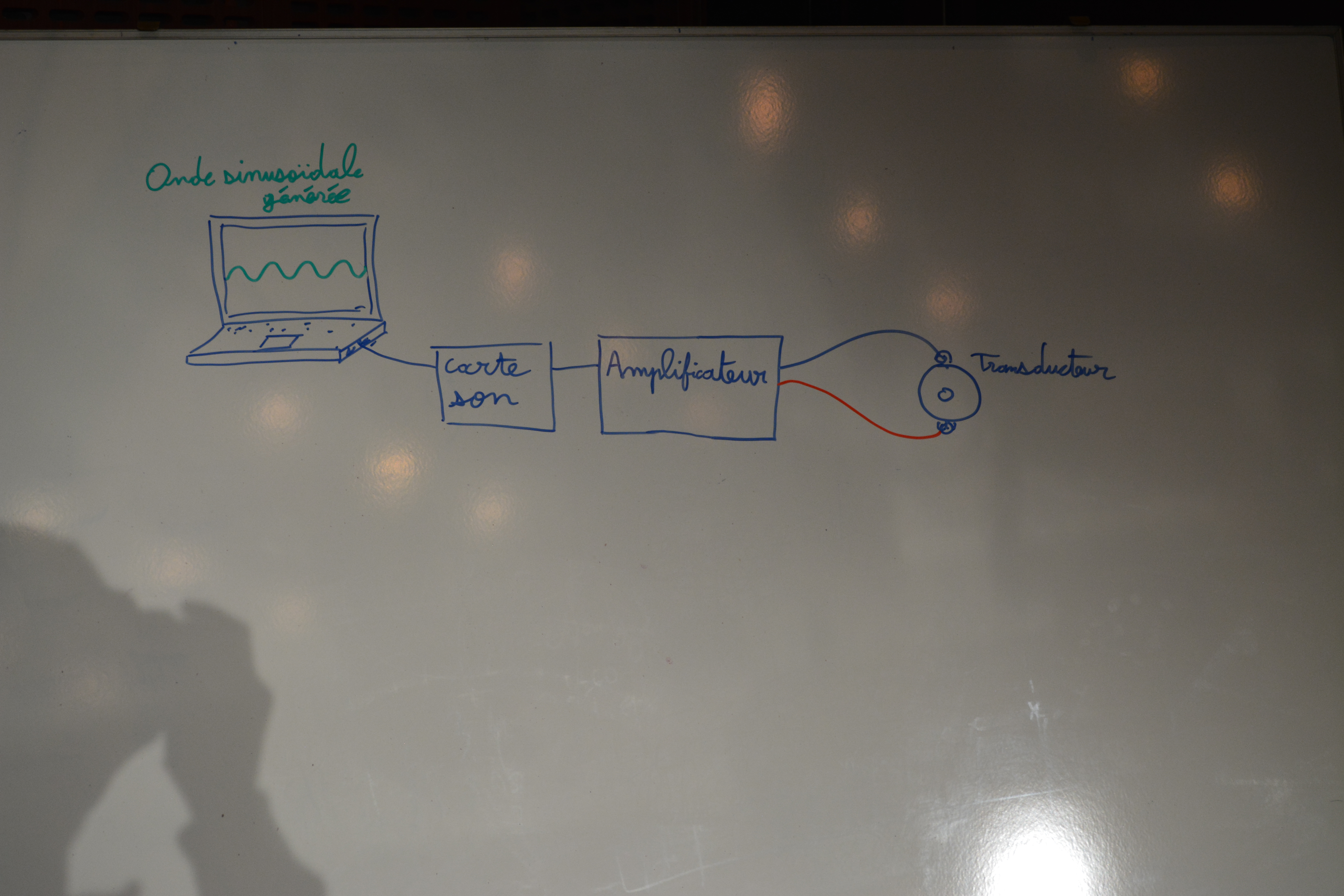 Nous allons avoir tout le matériel à disposition pour réaliser la lévitation acoustique. Nous préparons l’étude expérimentale : pour commencer nous voulons mettre en évidence l’onde stationnaire en «photographiant l’onde acoustique». Il serait intéressant d’avoir de l’azote liquide pour les photographies. Ceci nous permettra de mettre en évidence les nœuds et les ventres de pression.